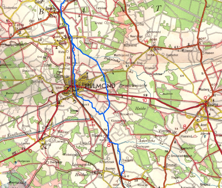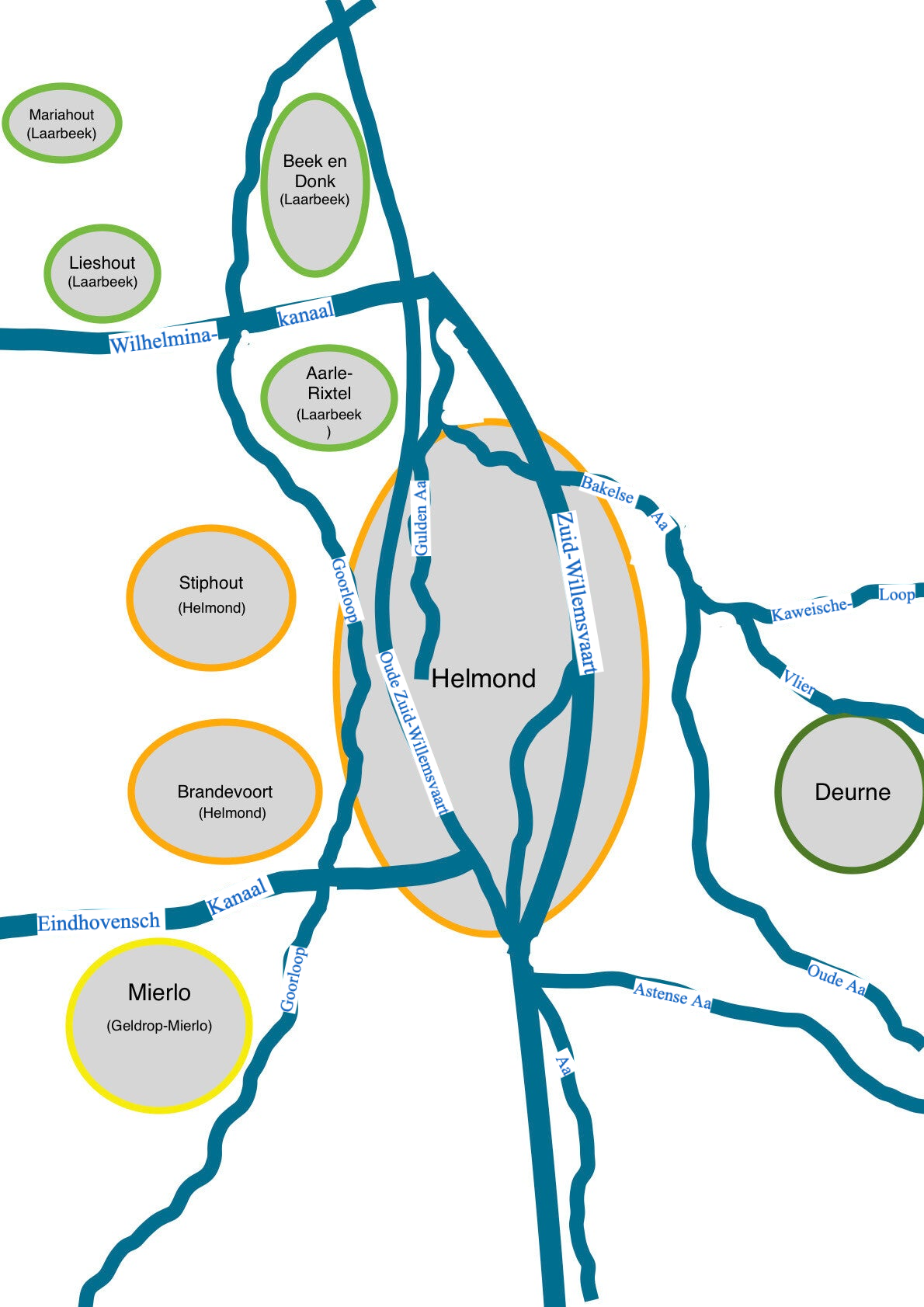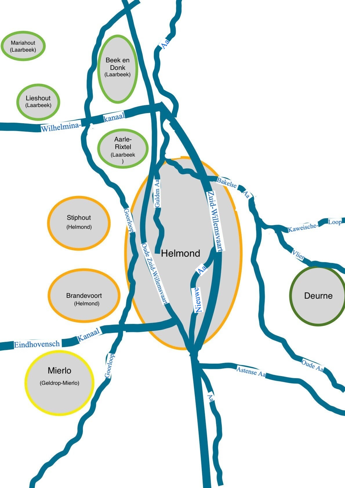 De kanalen en beken in de regio Helmond, ingetekend op een kaart van 1993.