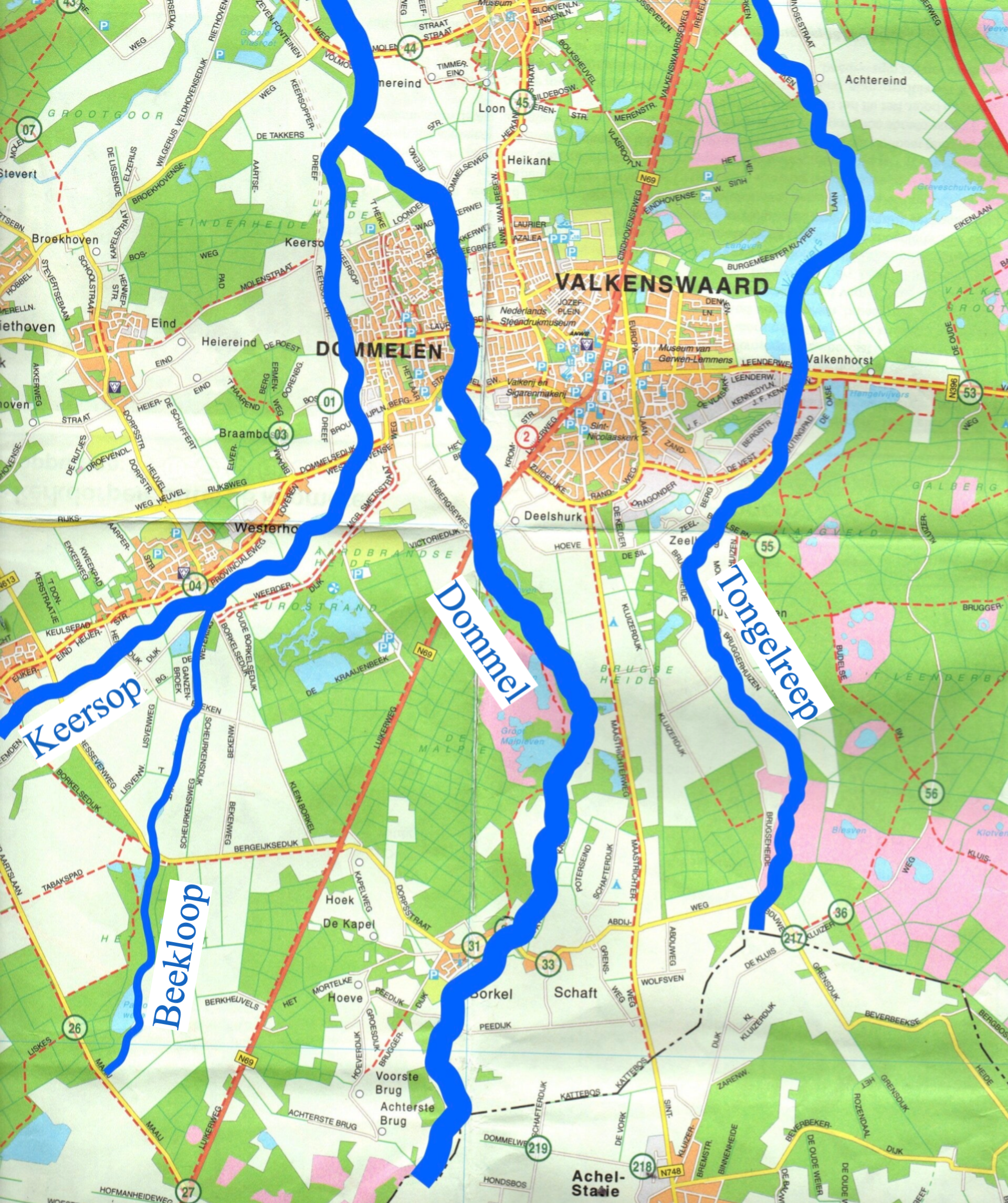 De Tongelreep komt bij de Achelse Kluis in Nederland, gaat aan de oostkant van Valkenswaard richting Aalst.